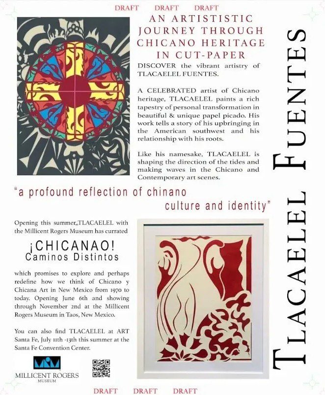 Last Summer Tlacaelel was asked by the Millicent Rogers Museum in Taos, NM to co-curate an exhibition of Chicano artists from around New Mexico. With such an exciting opportunity, Tlacaelel gladly accepted the invitation with vision and impetus. “I am thrilled to have been asked to reach out to artists around New Mexico and invite them to participate in what turned out to be a phenomenal exhibition.” That exhibition covered Chicano art from the 1970’s today and included some of the biggest names in Chicano art and history; names like Oscar Lozoya, Cecilio “Xilo” Garcia Camarillo, Luis Jimenez and others. This was a monumental undertaking as it involved 42 artists from around New Mexico and other states.